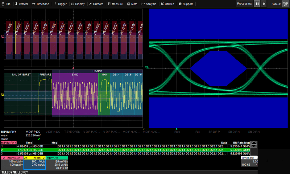 将问题与其根本原因联系起来通常需要查看多个域中的信号。 这 WaveMaster 8Zi-B 允许您将多种分析类型组合成一个单一的相关显示:模拟信号、协议解码、眼图、测量参数和其他相关信息并排实时显示。