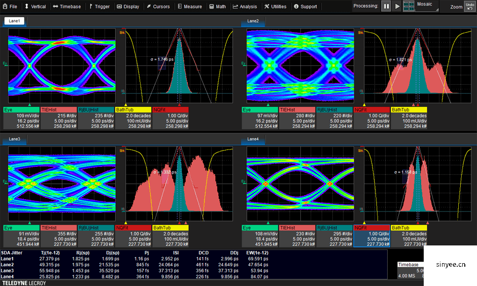 Teledyne LeCroy SDAIII-CompleteLinQ 串行数据分析产品包含多通道眼图和抖动分析、LaneScape 比较模式、垂直噪声测量和串扰分析工具。 这些功能提供了对多通道或单通道串行数据系统行为的深入了解。
