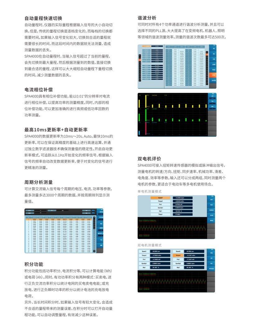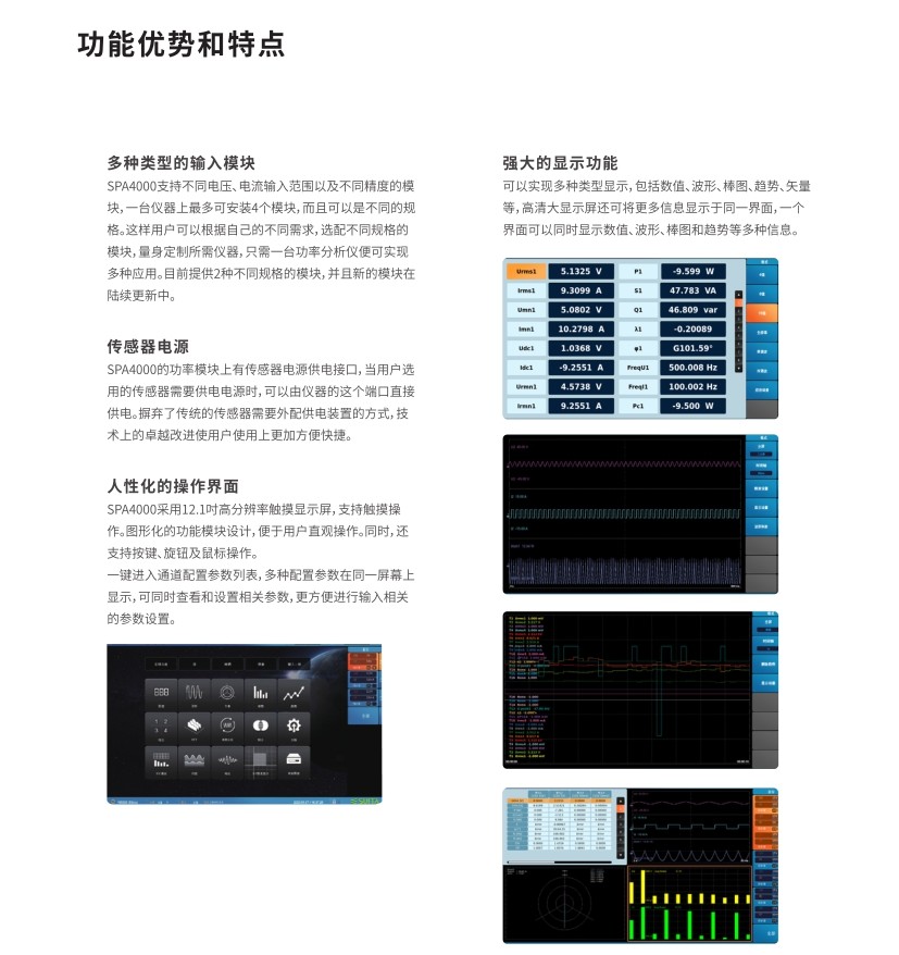 高测量精度+(读数的0.03%+量程的0.05%)采样速率为2MS/s4个功率通道+2个电机通道可组合配置、多种输入范围和精度的模块,可自主插拔可使用电压输出型电流钳或电流输出型传感器,以扩大仪器的测量电流范围仪器提供传感器供电电源输出,方便客户使用电流传感器