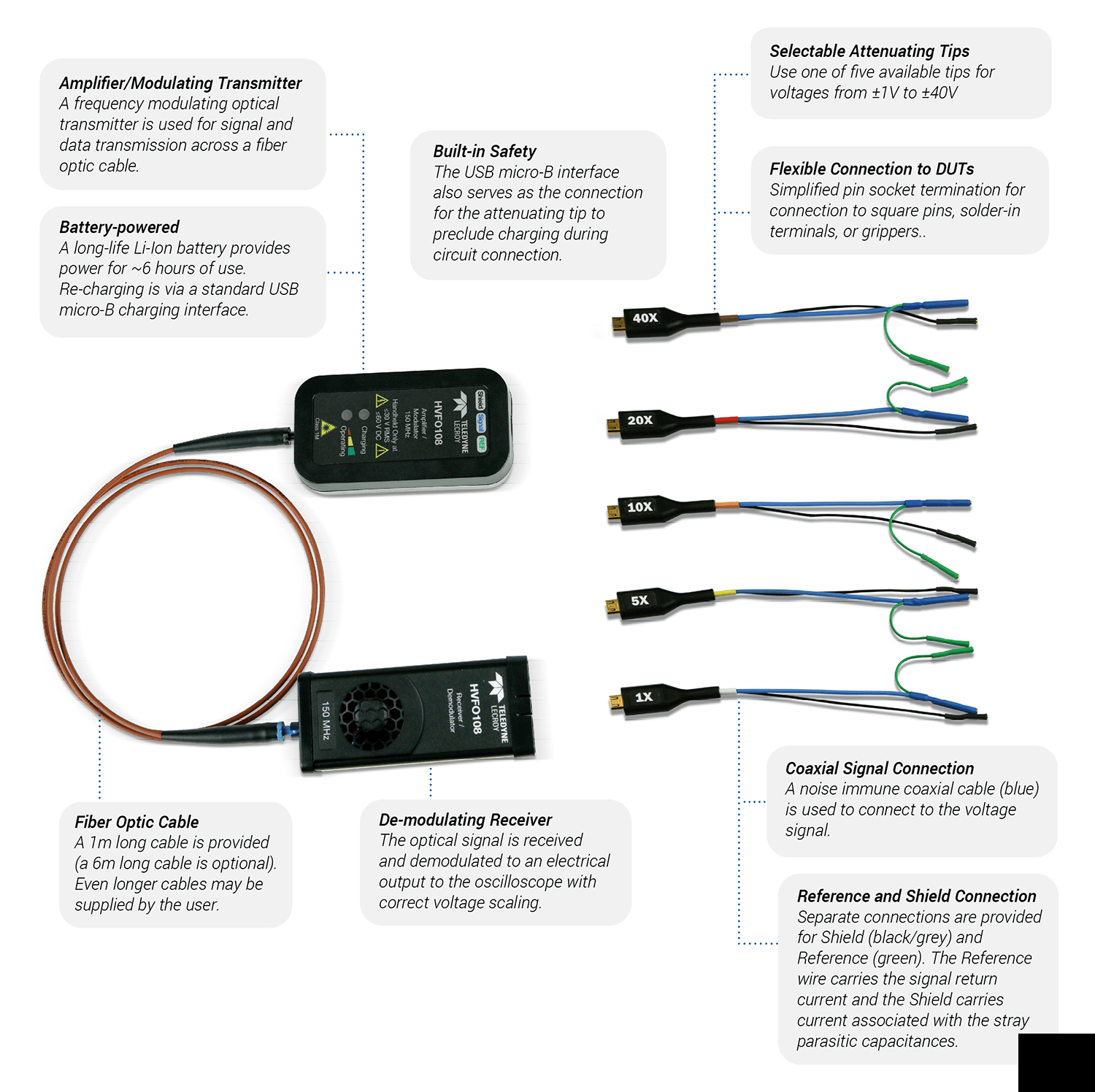 HVFO108-高压光纤探头,带宽为150 MHz。包括软手提箱。需要衰减尖端(单独订购)。包括数量。1 1m光纤电缆。 |