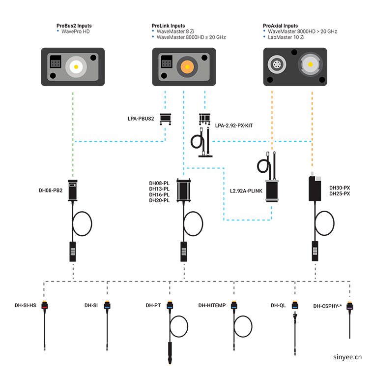 CrossSync PHY技术使得Teledyne LeCroy示波器的波形能够与协议分析仪的轨迹同时显示,实现了电气和协议信息的完整时间相关性。通过一系列支持CrossSync PHY的内插器,使用特殊的DH-CSPHY探头尖端,可以直接连接DH系列探头到高速信号线上。