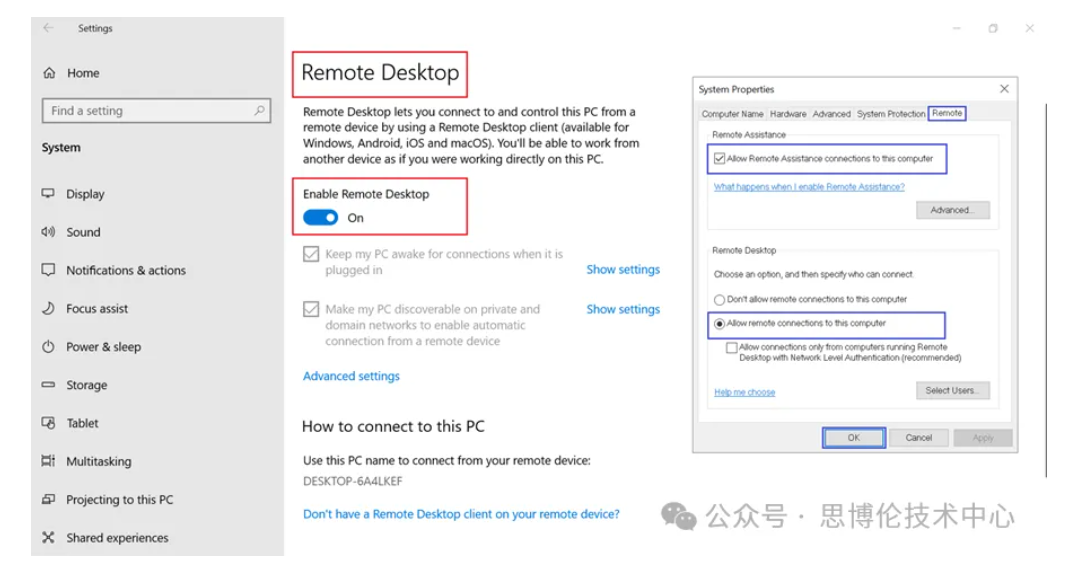 右击This PC,选择Properties,然后选择Remote,勾选”Allow Remote Assistance connections to computer”和“Allow remote connections to this PC”, 点OK。