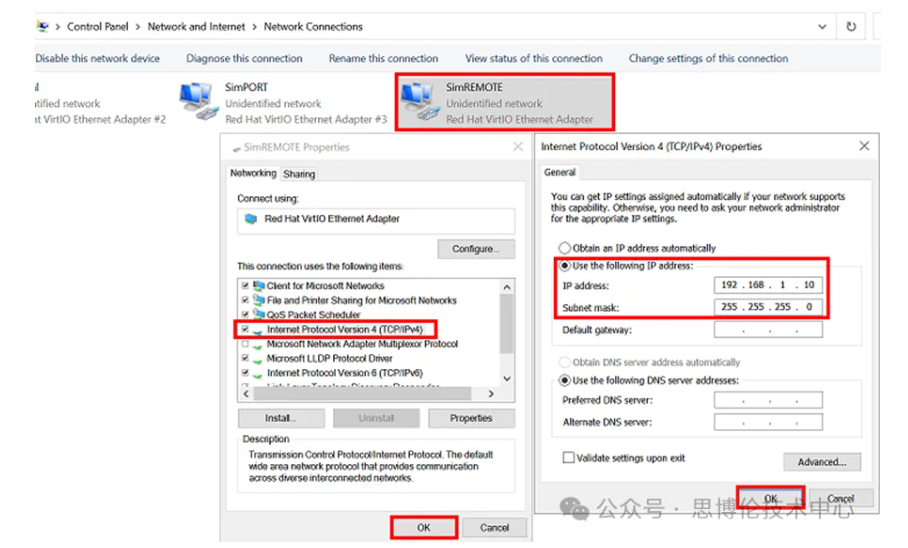 在搜索框输入View network connections并打开,右击SimREMOTE,选择Properties,然后是Internet protocol version 4,设置Use the following IP address,比如设为192.168.1.10,然后点OK。